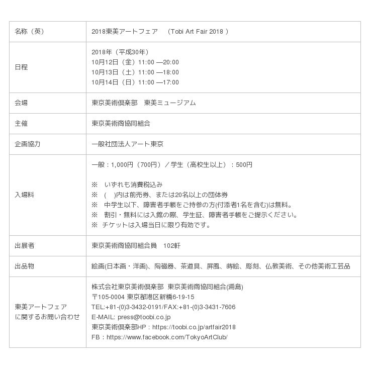 この度、日本を代表する美術商が一堂に集うアートフェア「2018東美アートフェア」(主催:東京美術商協同組合、企画協力:一般社団人 アート東京)を、2018年10月12日(金)~14日(日)の3日間、東京美術倶楽部(会場:東京都港区新橋6-19-15)で開催致します。