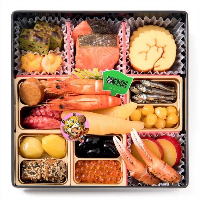 フジテレビ系列の大人気アニメ「ワンピース」&おせちの老舗「一冨士」コラボレーションおせち。12月31日に冷蔵にてお届けします。二段重にイラスト入り重箱などの付属品付き