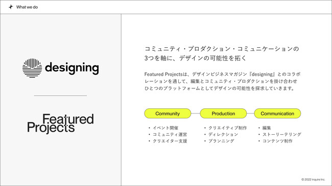 Featured Projectsはdesigningが培ってきたコミュニケーションに加え、コミュニティ・プロダクションの機能を掛け合わせ、ひとつのプラットフォームとして事業を展開していきます。