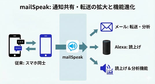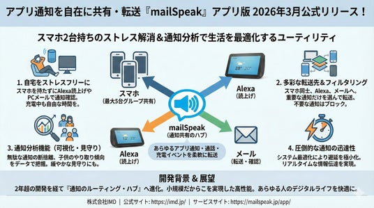 株式会社アイ・エム・デイ(IMD 本社:東京都港区、代表取締役社長:峯尾 淳一)は、2023年5月の初期リリースから2年以上の開発期間を経て、スマートフォンのあらゆるアプリ通知や通話イベント・充電イベントを、指定するデバイスやメール・Alexaへ柔軟に転送・共有できるAndroidアプリ『mailSpeak(メールスピーク)』を2026年3月に公式リリースいたします。
