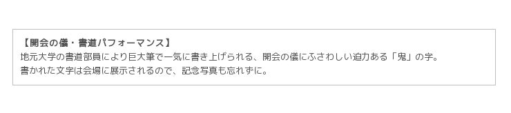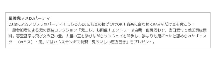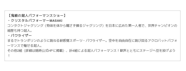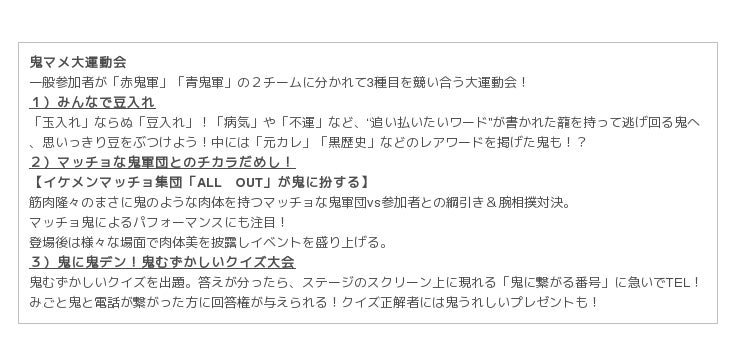 当日は節分にちなみ、鬼(=人並み外れた)をテーマに、超人によるパフォーマンスやマッチョな鬼軍団も加わる大運動会、鬼の仮装コンテストなど様々なイベントを開催。参加者は配られた豆を、パフォーマンス中の超人への応援やコンテストの審査投票など、様々な場面でステージへ投げて、投げて、投げまくります。