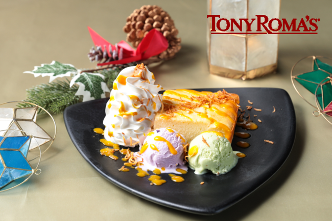 フィリピンで大人気のデザート「ビビンカ」をトニーローマ風にアレンジ。ウベ(紫芋)とピスタチオのアイスを添えて、ローストココナッツ、マンゴーソースで仕上げたフィリピンを代表するクリスマスのデザートです。