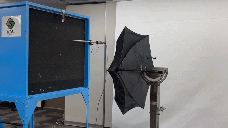試験では徐々に風速を上げていきます。突発的な風に対しては、傘フレームが折れてしまう場合があります