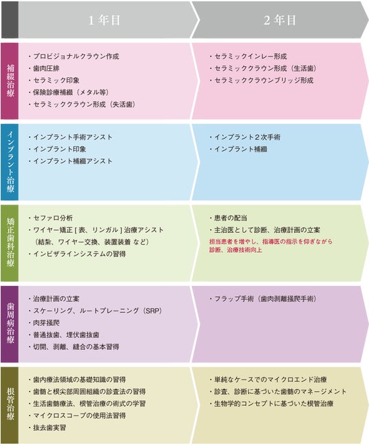 数年かけて全治療ができるようになっていただくための教育プログラムを策定しております。1年目は保険治療や資料採得(口腔内写真撮影、X線写真撮影、印象、プロービング等)などの診断、治療技術の基本から始まり、徐々に自費治療を担当していただきます。