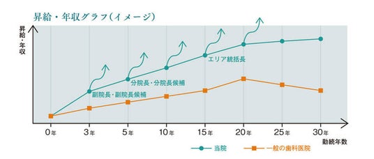 さらに、当医療法人は新医院の開設を進めており、将来的に次期分院長・副院長をめざせるキャリアパスを設けています。スキル向上に伴い評価も上がり、入社3年後には副院長(副院長候補)に、5年後には分院長(分院長候補)を務めていただきたいと期待しております。下記グラフは、現院長や副院長をモデルとし、これからの新医院の開設も含めたイメージ図です。なお、今後は希望する医師に対して開業支援制度も設ける予定です。
