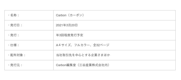 「Carbon」とは、炭素のことです。炭素は、結び付き方次第でさまざまな性質を発現することから、そのさまを、企業と企業が協業して結びつきイノベーションが生み出される姿になぞらえて、タイトルとしました。また、発行元である三谷産業は石炭の卸売からスタートし、当時はいわばベンチャー企業でした。今もなお「創業90年を越えるベンチャー企業」として、当時のスピリットを大切にする想いをこのタイトルに込めています。