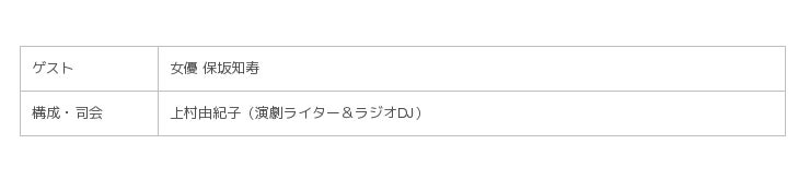 演劇ライター&ラジオDJの上村由紀子さんが、ミュージカルで活躍する俳優の「これまで」と「これから」に注目しながらここだけのおしゃべりを繰り広げるトークシリーズ。今回はHibiya Festival特別版として、歴代ゲストの中から続編のご要望も多かった女優保坂知寿さんを再びお招きします!