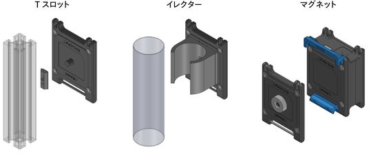 設置に使う取付ベースは、Tスロットやイレクターなど現場でよく使われる汎用部材にあわせてラインアップ。スタックしてワンタッチでロックできるため設置がかんたんです。防水・防塵仕様のため設置場所も選びません。移動や変更もかんたんです。