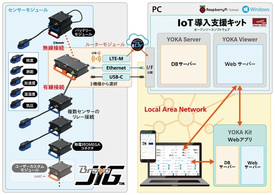 BraveJIGは、モジュール化された3種のルーター、および無線/有線に対応したセンサー群から必要に合わせて組合せ、オープンソースソフトウェアの「IoT導入支援キット」を使用することで、届いたその日のうちに「見える化」を実現します。