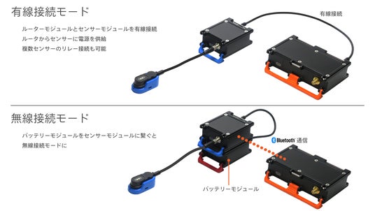 センサーモジュール、ルーターモジュール間の通信には、有線接続・無線接続モードがあります。センサーモジュールにバッテリーモジュールを接続すると無線通信モードに、センサーモジュールとルーターモジュールを通信ケーブルで接続すると有線接続モードとして自動的に機能します。