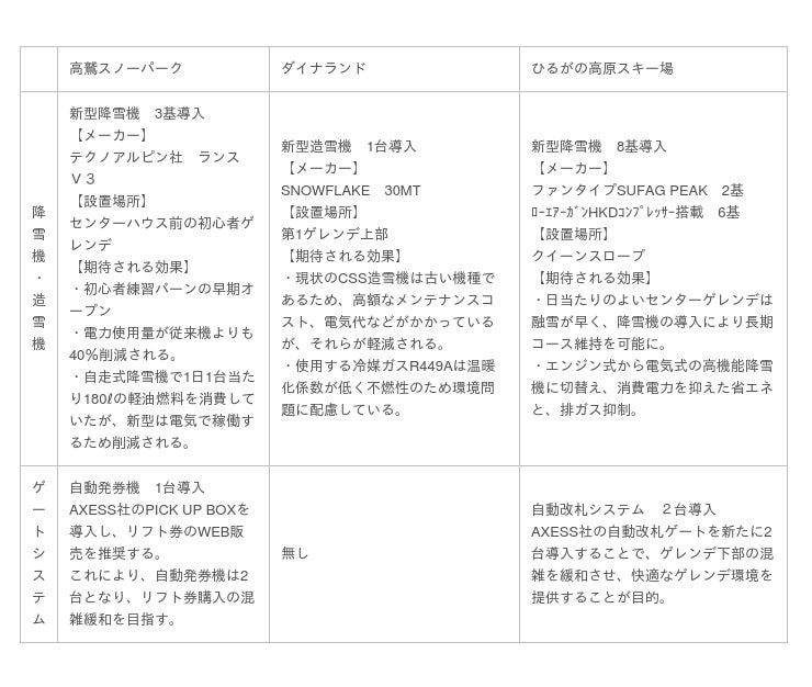 国内外問わず多くのお客様に安定したゲレンデオープンをご提供できるように環境問題にも配慮した省エネルギーの新型降雪機、造雪機の導入を行います。これにより各スキー場ではゲレンデの早期オープンに向けた様々な効果が見込まれます。さらにICリフト券ゲートシステムの追加や自動リフト発券機の導入も行い、お客様の快適性を向上させます。