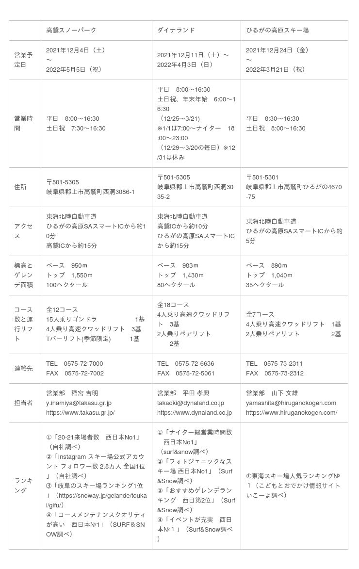 対象スキー場:高鷲スノーパーク・ダイナランド・ひるがの高原スキー場