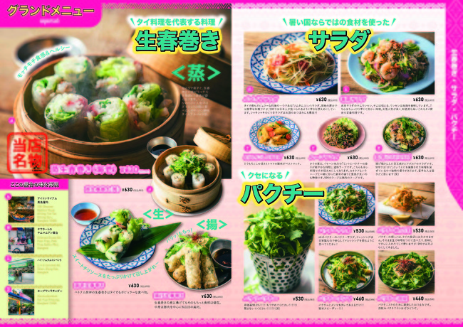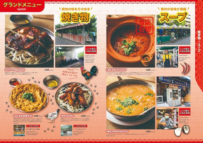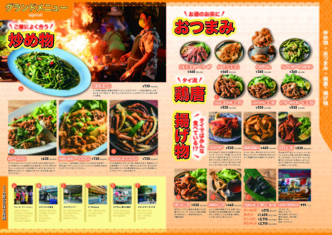 現在、コロナ禍により食環境と外食に対するニーズが大きく変化しており、外食の体験価値を高めることが求められています。今回の出店にあわせて当社では、ブランド価値向上とグラフィックでもよりタイを感じられるように、マリノデザインとコラボし、店舗内外装や看板、ロゴ、メニューブック(左画像)やグラスなどの細かな小物にいたるまでデザインをブラッシュアップしました。新たなロゴデザインは、ハット帽がトレードマークの当社代表の似顔絵を用い、親しみやすいデザインとなりました。その他、スタッフユニフォームのTシャツ・エプロンやコースターデザインを刷新し、オリジナルグッズとして店舗で販売もいたします。