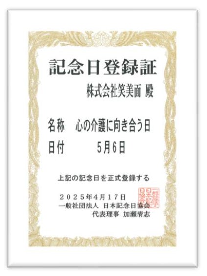 シニアホーム(※1)紹介事業の株式会社笑美面(本社:大阪市西区)は、5月6日を「心の介護に向き合う日」として、一般社団法人日本記念日協会に登録申請し、正式に認定されたことを本日発表します。