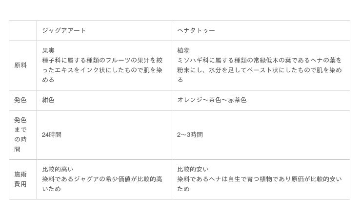 フルーツの果汁を絞ったエキスで染料となるジャグアインクを作り、このインクを用いて自由なデザインを肌に描いたものをジャグアアートといいます。染料を付けてから6時間程度放置し、洗い流すと一度すべて消えたように見えますが、24時間後に鮮やかな紺色に染まります。2週間程度デザインを楽しむことができます。