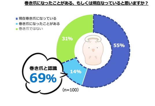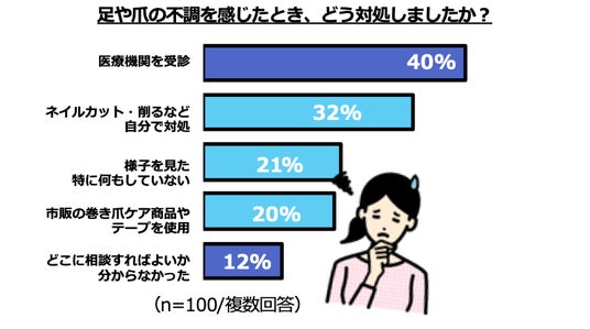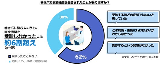 巻き爪になったことがある、現在も巻き爪である人は全体の69%という結果に。足や爪の不調を感じたとき「ネイルカット・削るなど自分で対処した」「様子を見た」「市販品で対応した」と、放置やセルフケアで対応している人がいることが判明。自身を巻き爪と認識している人のうち、病院を受診したことがない人は62%ということが明らかになりました。その理由として、「どの病院・医院に行けばよいかわからなかった」といった声が目立ちました。