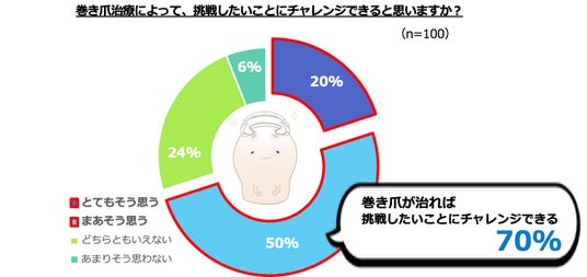 自身が巻き爪の場合、巻き爪を治療することで「再び挑戦したいことにチャレンジできると思うか」と尋ねた設問では、70%が「そう思う」と回答。こうした結果からは、足元の不調が行動の妨げとなる一方で、正しいケアと医療機関での治療によって、生活の質や前向きな気持ちが取り戻される可能性があることもうかがえます。