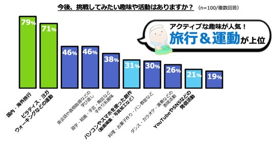 今後挑戦してみたい趣味・活動について尋ねたところ、最も多かったのは「国内・海外旅行(79%)」、次いで「ピラティス・ヨガ・ウォーキングなどの運動(71%)」という結果になりました。