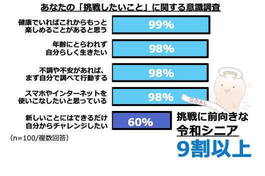 今回の調査では、98%の人が「年齢にとらわれず、自分らしく生きたい」と回答し、「年々挑戦したいことが増えている」と答えた人は82%、「スマホやインターネットを使いこなしたいと思っている」人も98%にのぼりました。こうした結果からは、趣味やテクノロジーに前向きな“令和シニア”の姿が多く見えてきます。挑戦を楽しもうとするシニアが、今、少しずつ増えてきているようです。