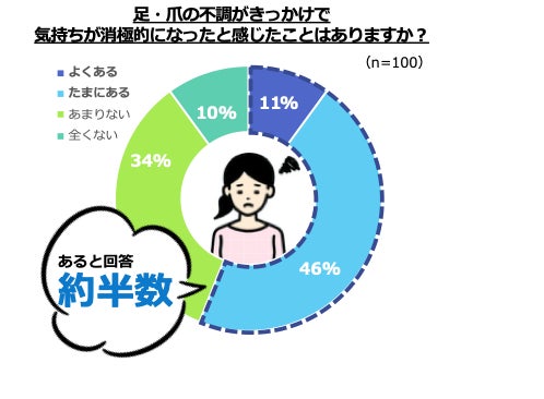また、「足・爪の不調がきっかけで気持ちが消極的になった」と回答した人は56%にのぼり、行動意欲がありながらも、足元の不安がその一歩を踏み出す妨げとなっている実態が明らかになりました。