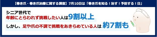 皮膚科学領域に特化する製薬会社であるマルホ株式会社(本社所在地:大阪府大阪市北区、代表取締役社長 杉田淳)は、巻き爪患者の病院受診を促す啓発プロジェクト「巻き爪をガマンしないで!PROJECT」の一環として、7月10日の「巻き爪を知る!治す!予防する!日」に向けて、50代以上のシニア世代を対象に、挑戦意欲と足・爪の健康に関する調査を実施しました。