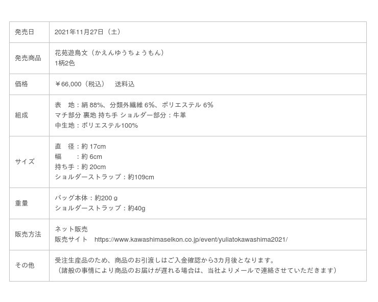 株式会社川島織物セルコン(本社:京都市左京区 社長:木村弘一)は、着物スタイリスト/DJとして活躍するマドモアゼル・ユリア(以下 ユリア http://yulia.tokyo/)とのコラボレーション Yulia To Kawashima(ユリア ト カワシマ)より新アイテムのハンドバッグ「花苑遊鳥文」を発売、11月27日(土)よりオンラインショップで販売を開始します。