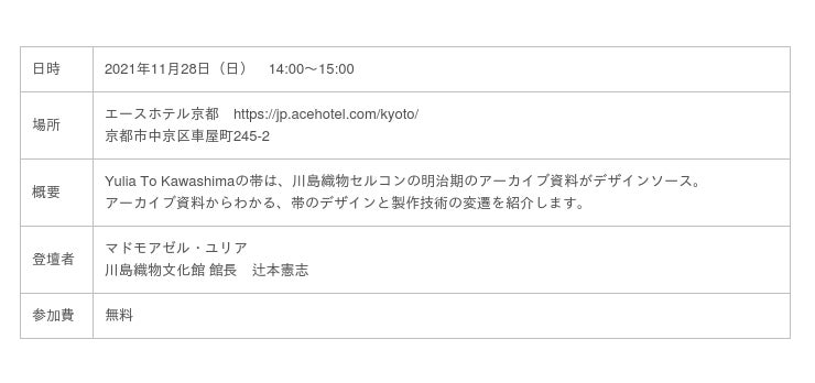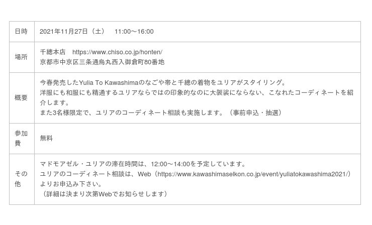 発売に合わせ、京都・三条烏丸の千總本店やエースホテル京都にて、着付け教室&ディナー、トークイベント、着物とのスタイリング紹介などのイベントも実施予定です。ユリアと川島織物セルコンのコラボレーションの今後の展開にご期待下さい。