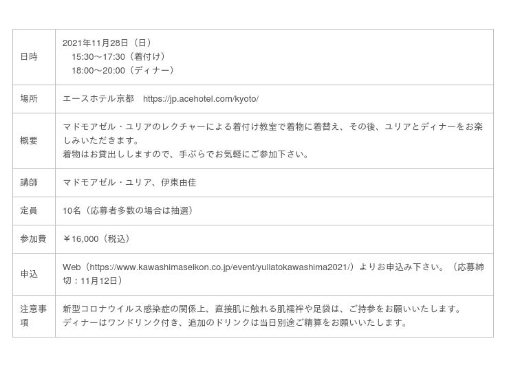 ユリアの着付け教室&ディナー 「ユリアのKIMONO SALON with Kawashima」