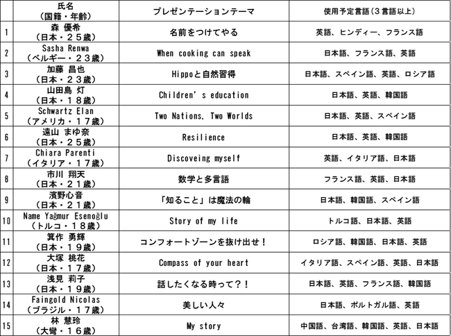 この大会は、ヒッポファミリークラブの活動で育った若者達が中心となり、多言語体験を通して見つけてきたことを世の中に発信しようと2015年1月に始まりました。これまでに登壇した若者達はのべ約267人にのぼります。特に今大会は過去最多の出場者が舞台に上がります。