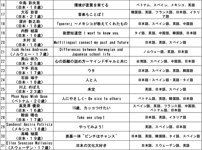 14ヵ国(日本、ベルギー、アメリカ、イタリア、トルコ、ブラジル、台湾、ノルウェー、ベトナム、メキシコ、スウェーデン、デンマーク、中国、タヒチ)の若者たちが出場