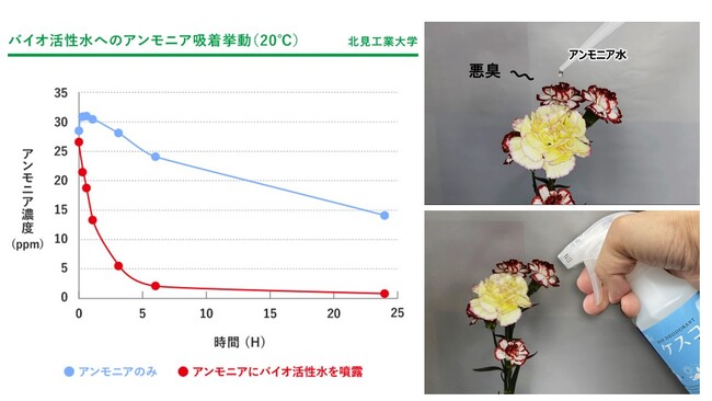 また花にアンモニア水をスポイトで垂らし、ケスコを噴射するとアンモニア臭だけを消します。花は枯れずに花本来の香りはそのまま残ります。