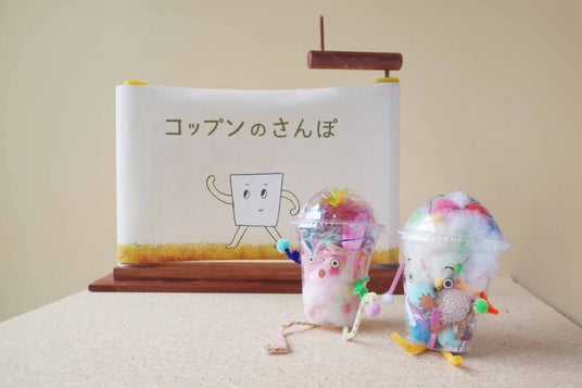 CORNERMIX×ワワワ コラボワークショップ「CORNER MIX」と「こどものためのでざいんぷろじぇくと ワワワ」のコラボワークショップの開催。ミックスジュースを作るときのワクワク感に着想を得て、ロール紙芝居「コップンのさんぽ」と、工作ワークショップ「コップンをつくろう」を制作。「コップン」はコップのキャラクターです。さんぽに出かけた空っぽのコップンに、色んな素材を詰め込むストーリーを、参加者の方も体験していただけたら、と工作ワークショップで再現しました。
