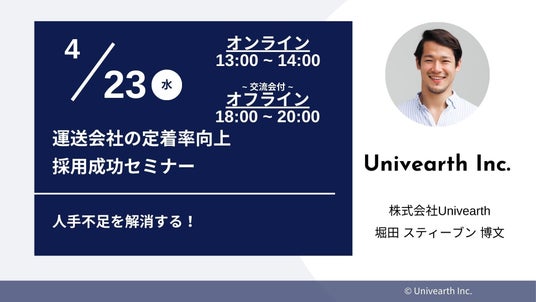 企業の物流戦略支援を行う株式会社Univearth(本社:大阪府大阪市北区、代表取締役:谷口 臨太朗)は、運送業界における深刻な人手不足を解消するため、オンラインセミナー「人手不足を解消する!運送会社の定着率向上&採用成功セミナー」を開催いたします。