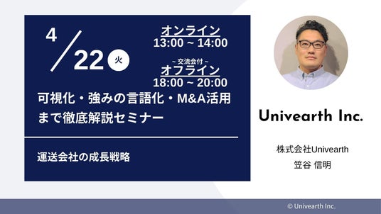 物流DXプラットフォーム『LIFTI』を運営する株式会社Univearth(本社:大阪府大阪市北区、代表取締役:谷口 臨太朗)は、運送会社の利益向上や、2024年問題のおさらいをテーマとしたセミナーをに開催いたします。