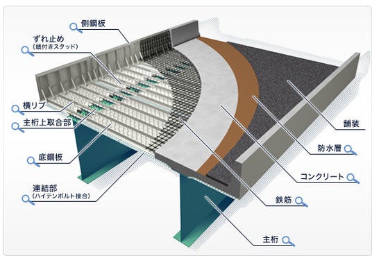橋梁の床構造の一部で鋼板または形鋼とコンクリートが一体となって荷重に抵抗するように構成された床版。(製作・販売:川田工業株式会社)