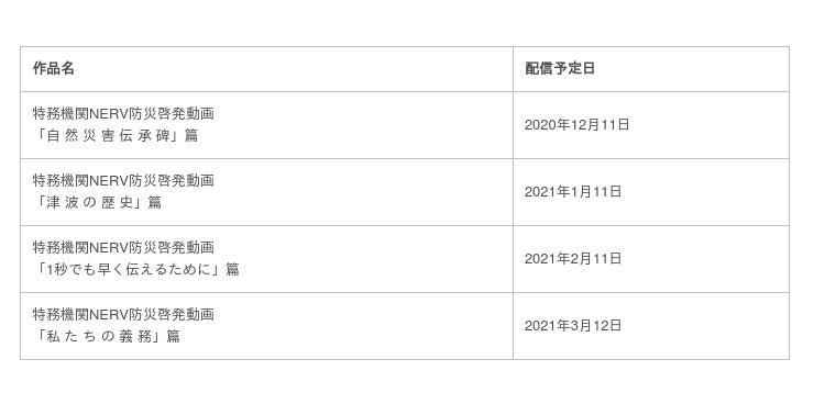 ゲヒルン株式会社(本社:東京都千代田区、代表取締役:石森 大貴、以下「ゲヒルン」)は、2020年12月11日から2021年3月にかけて、特務機関NERV防災啓発動画4作品を順次配信します。