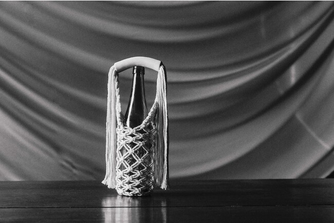 丹念に編み込まれたマクラメが表現するボトルホルダーと壁掛け用のフラワーベース