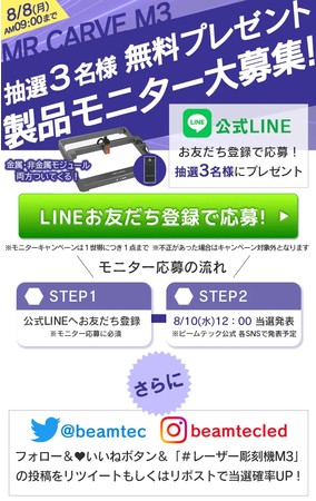 「DAJALASER-M3」の発売を記念して、実機を無料でお試しいただくモニターキャンペーンを実施。モニター様を2022年8月1日(月)~8月8日(月)にビームテック公式の各SNSで募集します。