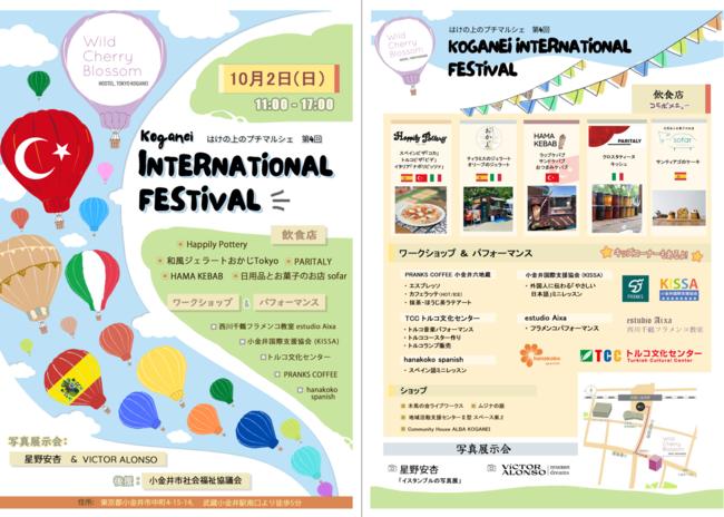 「Wild Cherry Blossom- HOSTEL,TOKYO KOGANEI-」では、イタリア・トルコ・スペイン出身のスタッフが中心となって、地域の飲食店、事業者らとタイアップ。キッチンカーでは、この日限定のコラボメニューなども登場。その他にもラテアート体験、スペイン語ミニレッスン、フォトグラファーによる各国の写真展示、民族楽器演奏やダンスショー、キッズ向けワークショップなどが開催され、大人も子供も3ヶ国を縦横無尽に楽しむことができるイベントとなっています。