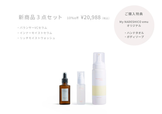 更なる美しさへのステップアップとして、エイジングや繰り返す肌荒れにフォーカスした高機能系スキンケアラインの『My NADESHICO emu』シリーズ から《全ての肌悩みにアプローチできる》をコンセプトに、新たに3つの商品が発売されます。