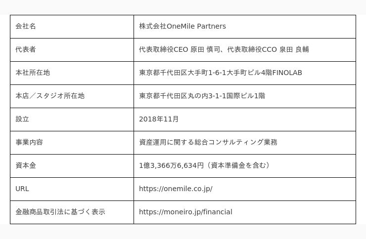 オンライン・オフラインで、個々のニーズにあわせプロが厳選した資産運用プランを提供する株式会社OneMile Partnersは、2020年11月27日、会員制サービス「moneiro(マネイロ)」の運営を開始致しました。