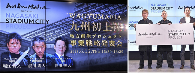 このプロジェクトの始動に際して「『WAGYUMAFIA』九州初上陸 地方創生プロジェクト事業戦略発表会」を2023年6月15日(木)に、ベクトルスタジオ(東京都港区)で実施しました。当発表会ではWAGYUMAFIA株式会社 代表取締役 浜田 寿人、取締役 堀江 貴文による事業戦略が発表され、ジャパネットグループ代表 高田 旭人氏からは長崎スタジアムシティプロジェクトについて発表がありました。