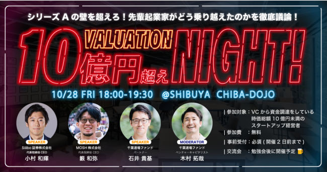 時価総額10億円超えNight!!は、シリーズAやそれ以降のラウンドの資金調達を成功させるために必要なことを学ぶことができる、アーリーステージの起業家向けの勉強会です。千葉道場コミュニティに参加する現役起業家2名をゲストスピーカーとしてお招きし、以下のようなトピックについてディスカッションします。