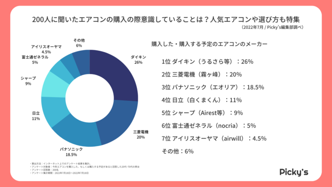 このたびPicky’s(https://rentry.jp/note/)では、エアコンの購入に関して意識していることや購入するエアコンの機種についてインターネット上でアンケート調査を行い、ランキングを作成いたしましたので発表いたします。