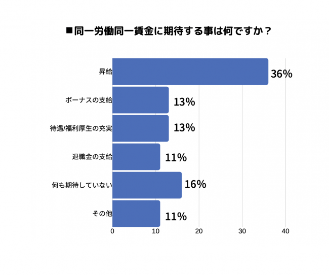 ■「同一労働同一賃金に期待する事」1位は36%の「昇給」