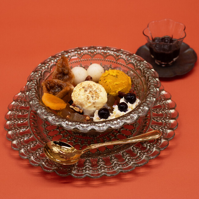 ほうじ茶に漬けた寒天に、皮付きかぼちゃ餡、白玉、自家製いちじく煮と蜜漬けあんず、ローストペカンナッツをトッピングしました。バニラアイスクリームには山椒をひとふり。仕上げにマスカルポーネチーズとブルーベリーのお花を咲かせて…