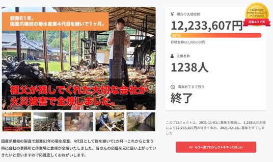 クラウドファンディングの画面 キャンプファイヤークラウドファンディングアワード2022も受賞