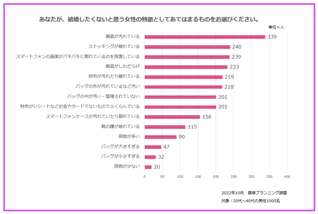 コンテンツ制作をプロデュースする株式会社真琴プランニング(本社:東京都中央区、代表取締役社長:笹山 真琴)が、20代~40代の男性1000人を対象に行った「結婚したくない女性の特徴」に関する調査によると、ワースト1位が「服装が汚れている」(339人/1000人中・以下同)、2位が「ストッキングが破れている」(240人)、ワースト3位に「スマートフォンの画面がバキバキに割れているのを放置している(239人)、4位が「服装がしわだらけ」(233人)、「財布が汚れたり破れている」(219人)と続きました。
