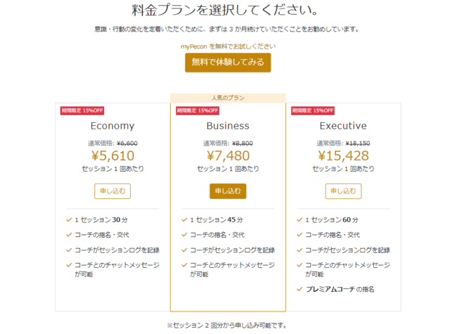 オンライン・コーチングmyPeconでは、サービスリリース5周年を記念して、初めてmyPeconを購入下さる方を対象にEconomy(1回30分)/Business(1回45分)/Executive(1回60分)の全コースのセッションを6月30日(木)まで15%OFFにて販売いたします。コーチングセッションは2回分~最大24回分までご購入頂けます。通常価格より最大65,328円お得なキャンペーンとなっています。