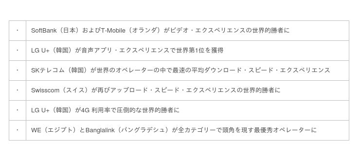 ソフトバンクは、2つのカテゴリー (ビデオ・エクスペリエンスとモバイル・ゲーム・エクスペリエンス) において、世界的勝者となったが、どちらの場合も、オランダのオペレーターであるT-Mobile (ビデオ・エクスペリエンス) と Vodafone (モバイル・ゲーム・エクスペリエンス) が首位に入っている。